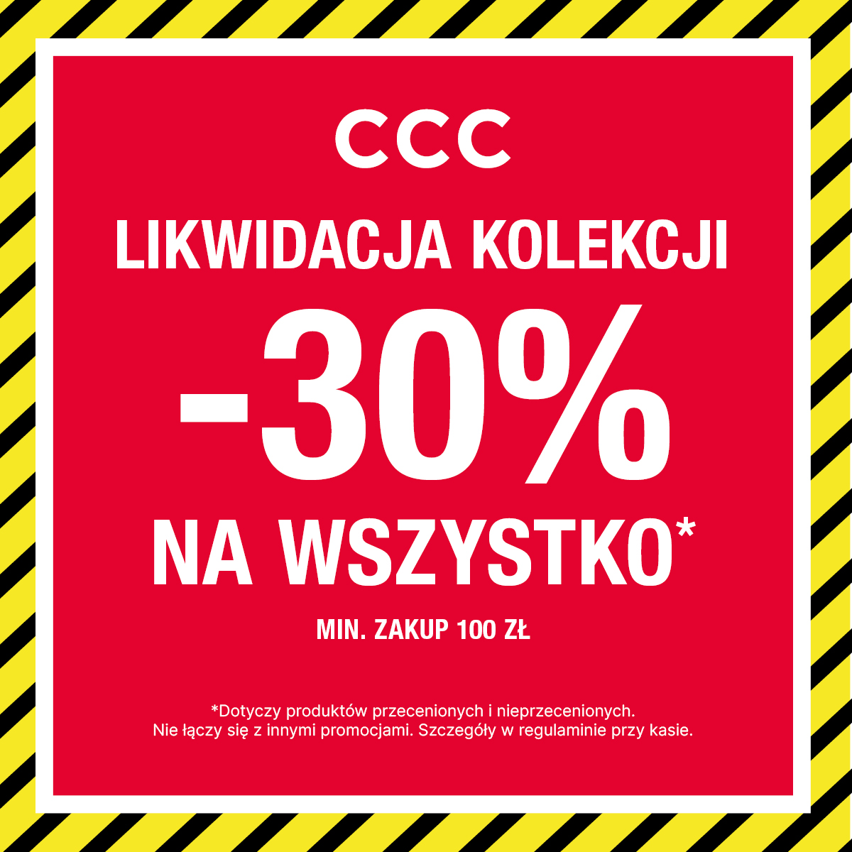 LIKWIDACJA w CCC! -30% na WSZYSTKO przy zakupach za minimum 100zł! Tak na WSZYSTKO. Buty, torebki i akcesoria znanych marek kupisz teraz 30% taniej! Kup, zanim najlepsze modele znikną! Promocja obowiązuje w salonach CCC. Szczegóły w regulaminie